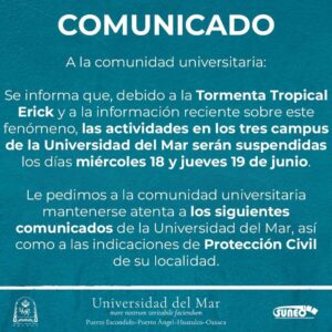 Al mismo tiempo, la UMar suspendió sus actividades académicas y administrativas los días 18 y 19 de junio en sus sedes de Puerto Escondido, Puerto Ángel y Huatulco, en previsión de las condiciones meteorológicas que podrían agravarse en las próximas horas.