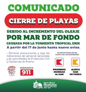 La Tormenta Tropical Erick ya deja sus primeras consecuencias en la Costa oaxaqueña: playas cerradas en Huatulco y clases suspendidas en todos los campus de la Universidad del Mar.