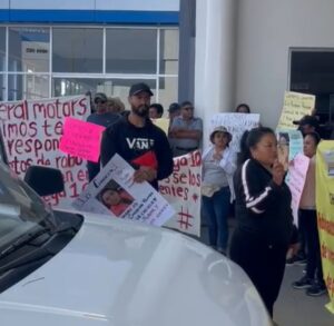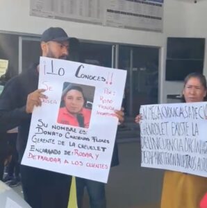 La mañana de este lunes, un grupo de personas inició una protesta en la agencia de autos Chevrolet ubicada sobre el Periférico, acusando a la empresa de fraude y robo.