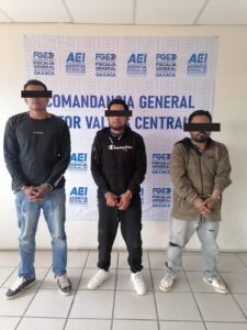 Oaxaca de Juárez, Oax., 1 de agosto de 2025.- En el marco de la Operación Cazador implementada en la Zona Metropolitana de Oaxaca, corporaciones de seguridad detuvieron a tres masculinos por su posible responsabilidad en el delito de robo a negocio con violencia en la colonia Dolores del municipio capitalino.