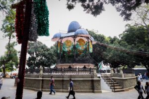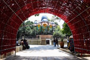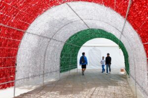 El punto central del zócalo concentra la mayor atracción, ya que se colocaron túneles tricolores y letras gigantes con la leyenda “Viva México” en el kiosco, convirtiéndolo en un espacio ideal para fotografías y convivencia familiar.
